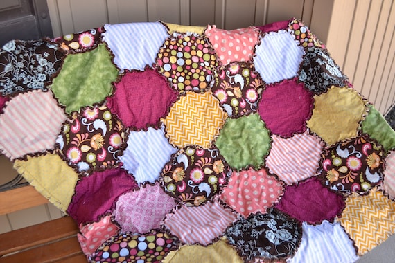 This hexagon baby quilt is created from 5″ charm squares.